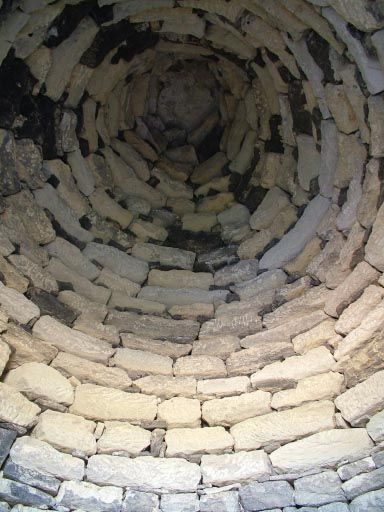 La voûte à encorbellement est construite avec de longs blocs réguliers retaillés (coup de pic) en calcaire gréseux, gris et blancs.