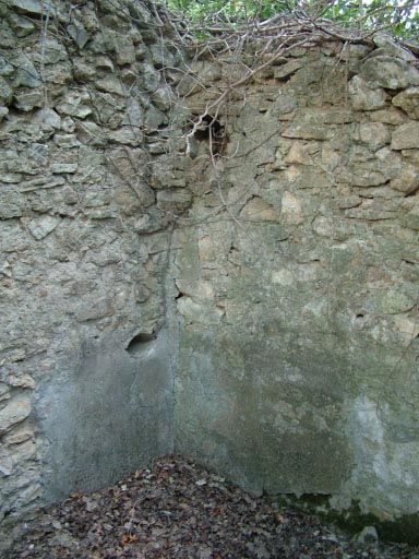 Au fond d’une parcelle boisée ancienne olivette, entouré d’une sorte de terrasse surplombant légèrement la parcelle, mais en contrebas de la terre voisine, maset de plan carré, murs de calcaire dur jointoyés, façade enduite. Ouverture (1,90 x 0,80 m) décentrée orientée est, linteau, piédroit, en pierre de taille de calcaire gréseux avec feuillure, 3 conduits circulaires l’un fait de 2 tuiles creuses ayant porté peut-être une gouttière dans un citerne (2 pans de murs de 1 m enduit dans un angle, proche des conduits), 1 cheminée avec linteau gréseux. Toiture à 2 pans, en tuiles creuses effondrée.