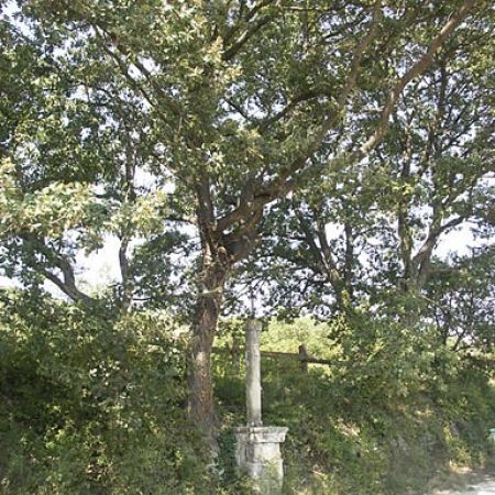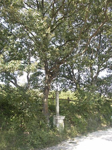 Le petit monument en retrait de la voie communale, dont une partie du socle est incluse dans un mur de soutènement est implanté contre un chêne blanc dont