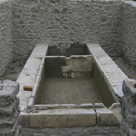 A l'intérieur un passage sur trois côtés permet l'accès à deux bacs inégaux en maçonnerie de pierres de 0,47 m d'épaisseur enduite avec un mortier taloché fin et couronné de pierres calcaires taillées pour permettre le lavage du linge.