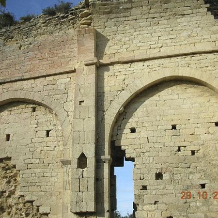 - du mur nord de la nef avec le départ de la voûte en berceau, c'est une mur d'appareil régulier en pierre de taille calcaire.