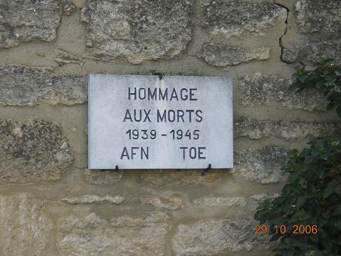 - Une plaque en marbre portant l'inscription : "Hommage aux morts 1939-1945 AFN TOE"